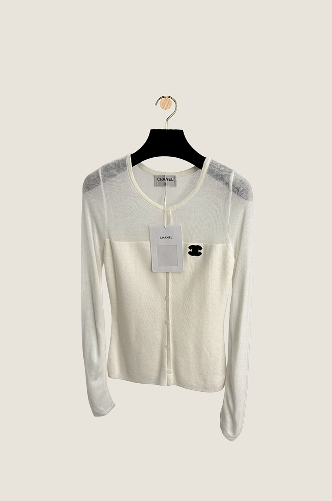 Elegant and whisper-light, the Éclat de Neige cardigan reflects the understated luxury synonymous with Chanel. Crafted in soft ivory knit with a sheer upper panel, this design evokes the purity of snow and the delicacy of Parisian craftsmanship. Accented by the maison’s signature black CC emblem, it embodies effortless sophistication — a timeless layering piece for the woman who moves with quiet confidence.