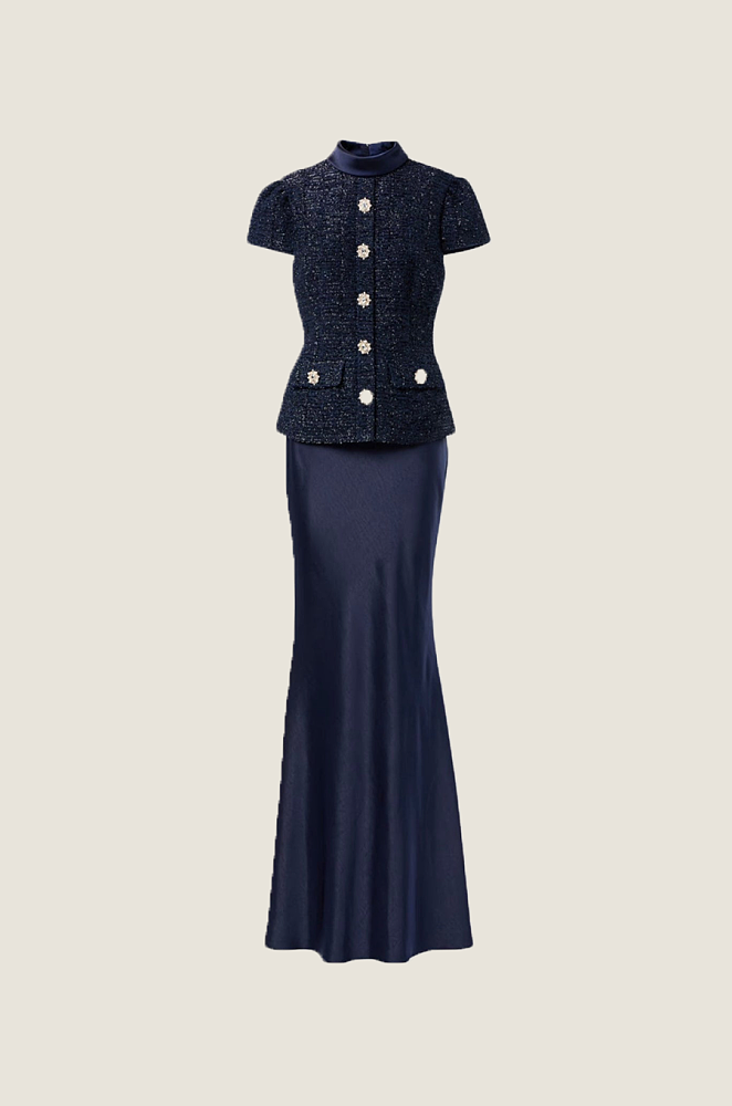 •    Two-piece luxury set: tweed jacket + satin maxi skirt