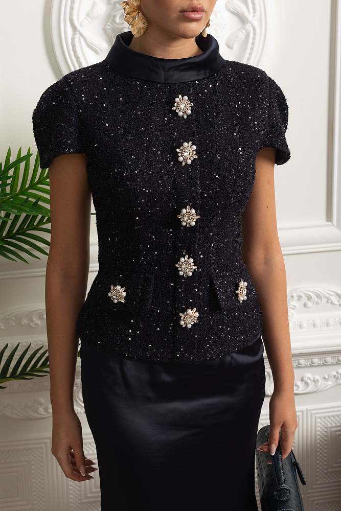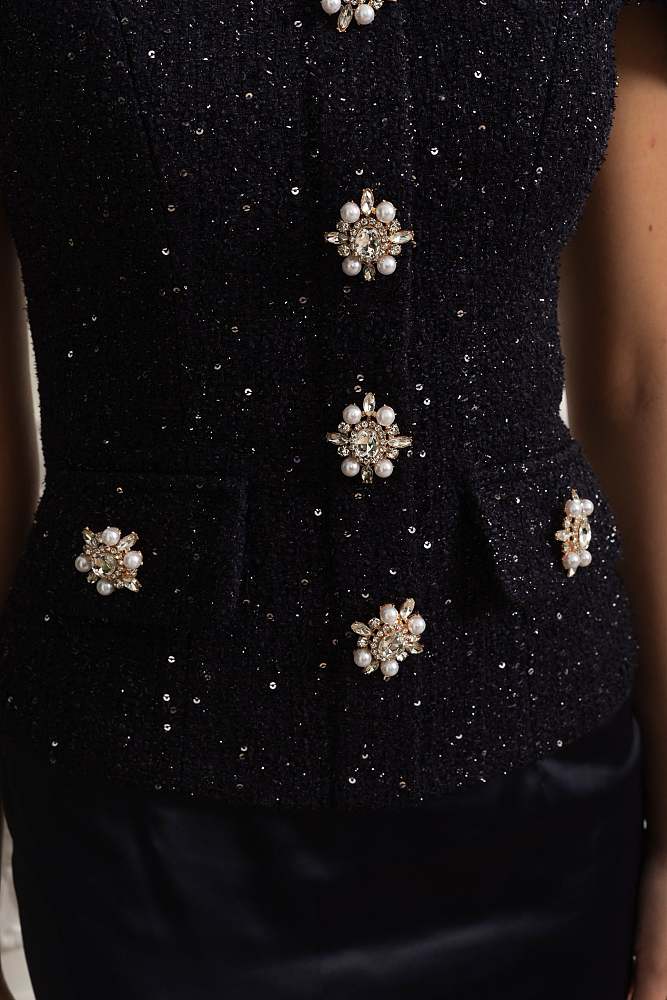 Evoke the quiet power of Parisian sophistication in the Château Lumière Ensemble — Midnight Édition. Crafted in a deep navy hue that mirrors moonlit satin, this two-piece set embodies timeless refinement and modern allure. The cropped tweed jacket, adorned with hand-set crystal and pearl floral buttons, pairs seamlessly with a fluid silk-satin maxi skirt that drapes like liquid nightfall.