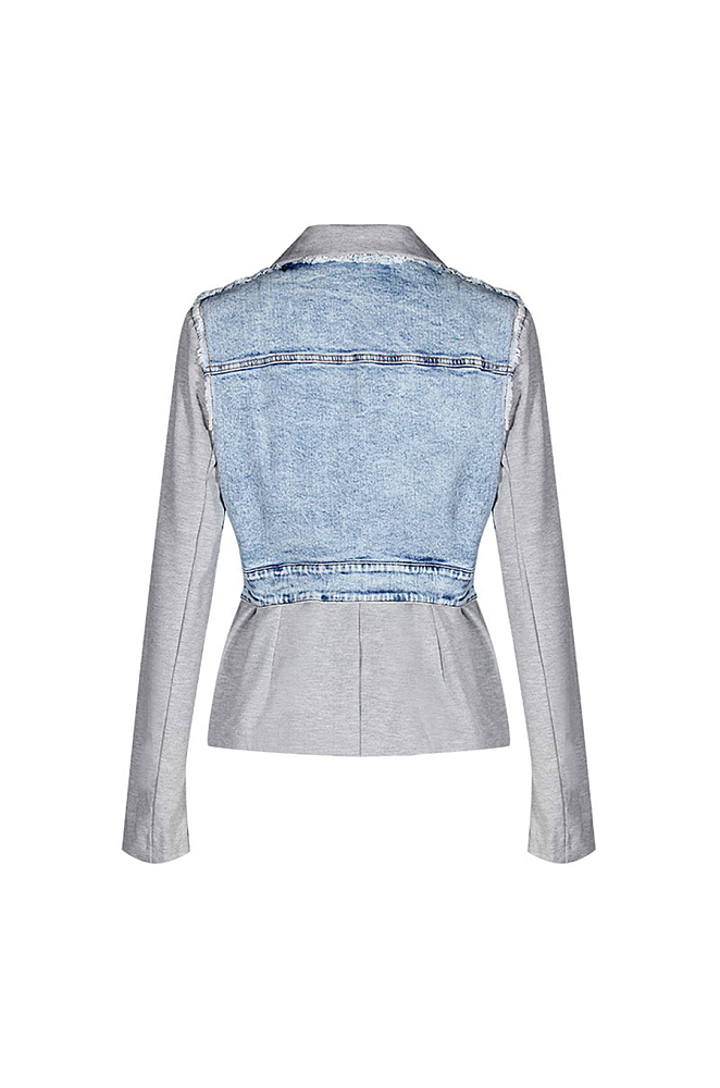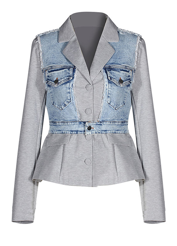 The Vestige Denim Hybrid Blazer redefines tailoring with an urban-meets-couture twist. Structured in soft heather grey fabric with sharp lapels, the design is layered with a distressed denim vest overlay, creating a dimensional silhouette that’s both edgy and refined. A subtle peplum flare at the waist sculpts the figure, while chest pockets and raw-cut denim edges nod to its streetwear influence. Perfect for day-to-night styling, this jacket embodies modern versatility with unapologetic sophistication.