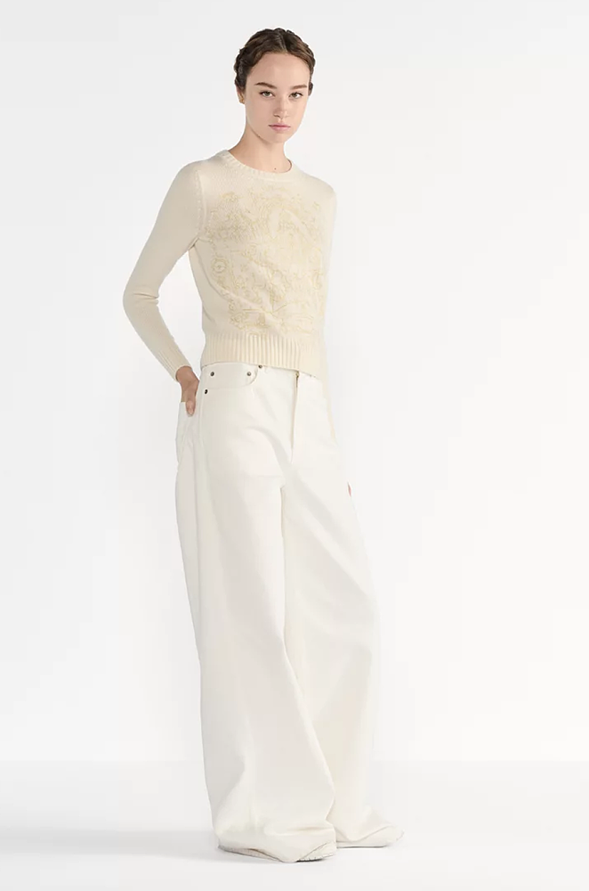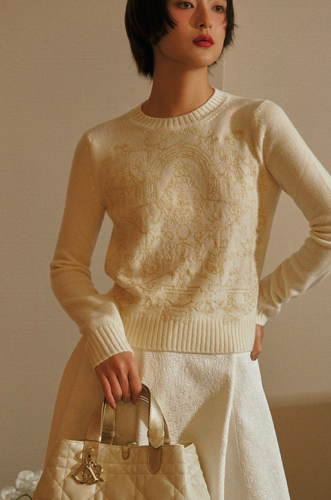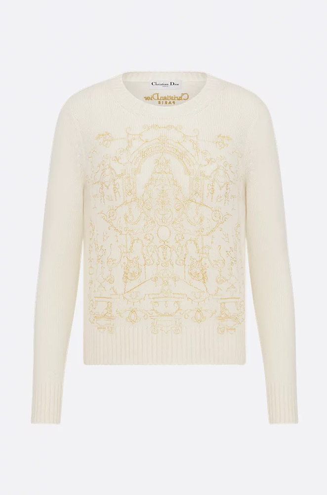 An exquisite expression of Dior’s heritage elegance, this ivory knit sweater features an intricate tonal Toile de Jouy–inspired motif delicately embroidered across the front. Crafted in a fine-gauge knit with a softly structured silhouette, the piece embodies timeless Parisian refinement while remaining effortlessly modern. The subtle gold-toned detailing elevates the design, making it a standout luxury essential that transitions seamlessly from day to evening styling.