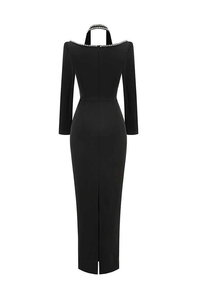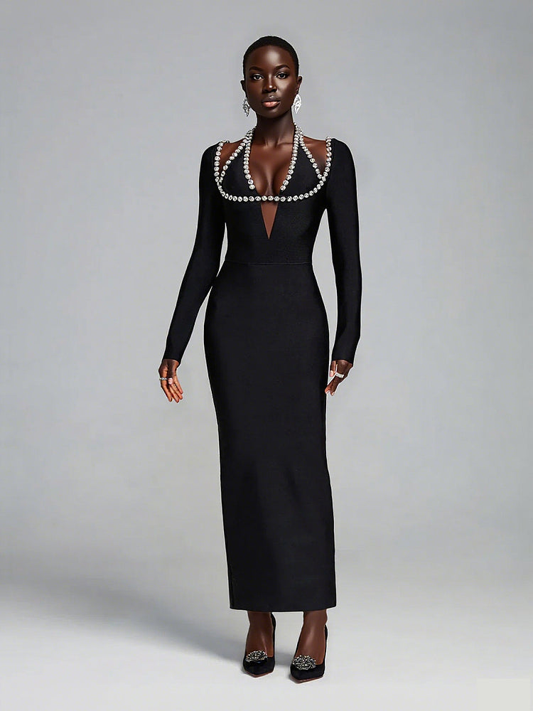 The strategic cutout and sculpted drape create a play of light and shadow — balancing sensuality with refined sophistication. A masterpiece for the woman who embodies both mystery and magnificence.