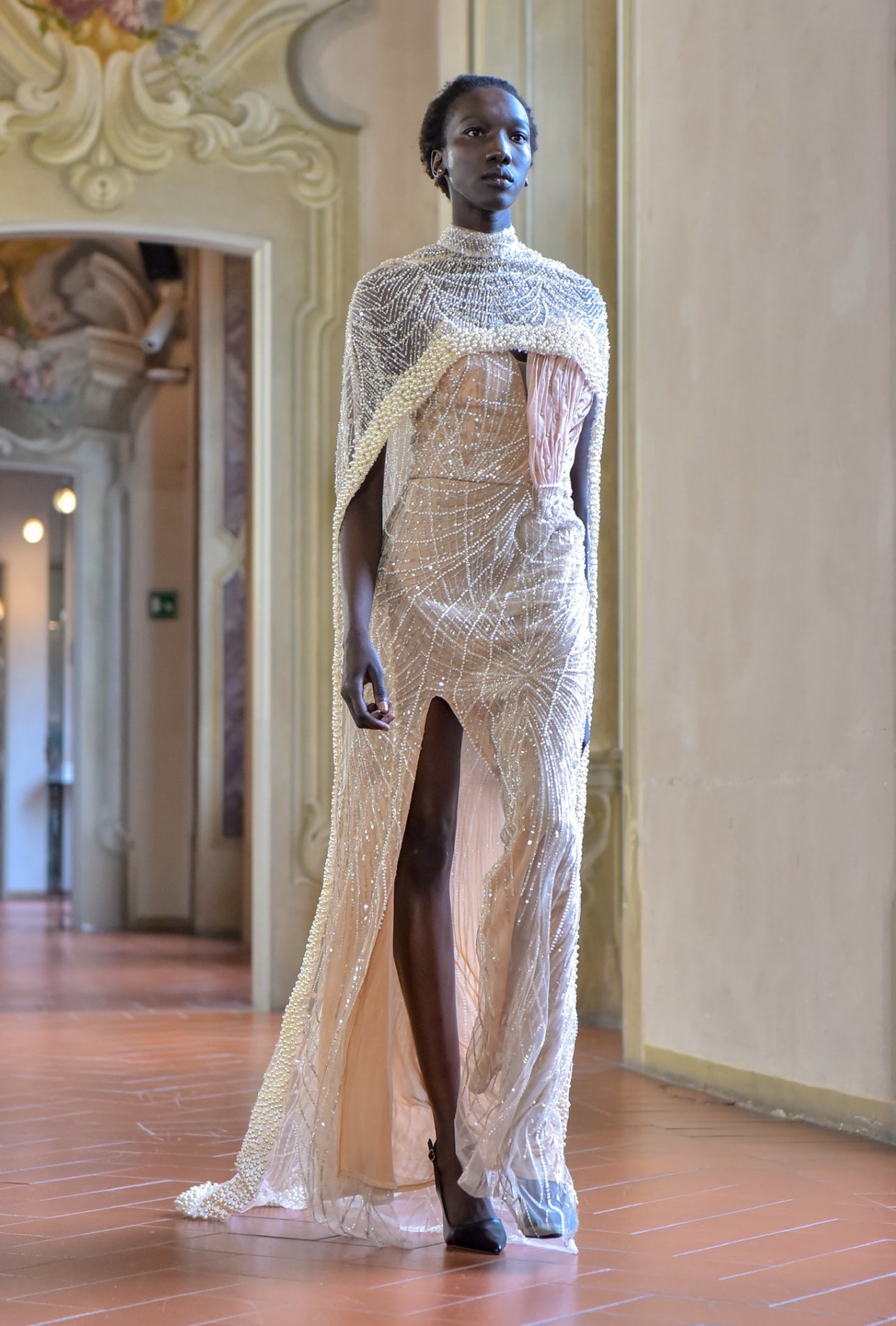 Crafted in layers of nude-champagne tulle, Halo Imperial captures the balance between grace and authority — the essence of the Velour de Luxe woman. Designed to command presence on the grandest of runways, from Milan to the red carpet.