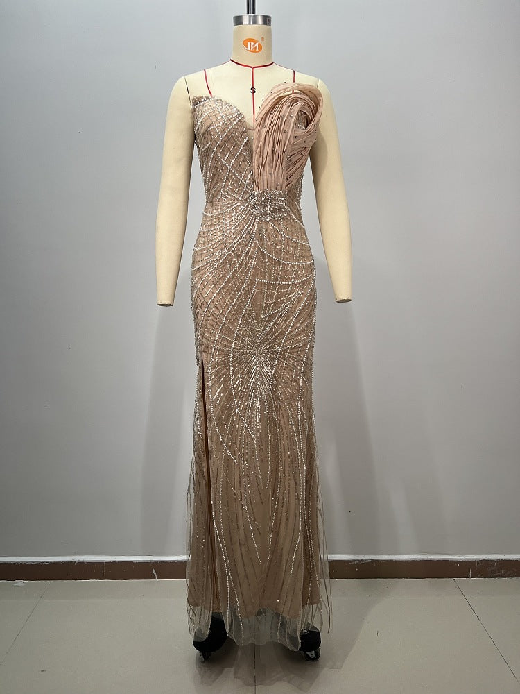 A celestial statement of regality and radiance, the Halo Imperia gown is a masterpiece of couture architecture. Intricately hand-beaded in crystal constellations that shimmer with each step, this gown evokes the ethereal aura of divine power. The sculpted pleated bust blooms like a crown of light, while the fitted silhouette and high slit merge timeless elegance with modern allure.