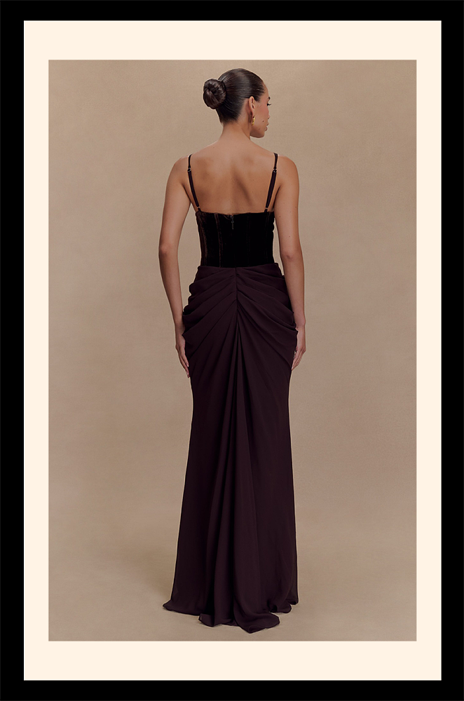 An ode to sensual minimalism and sculpted grace, the Mocha Éclat gown embodies the harmony between structure and fluidity. Designed in a rich mocha hue, its velvet bustier bodice contours the figure with corset precision while sheer straps frame the shoulders in delicate transparency. The gown flows into a cascade of soft, gathered drapery — a masterful play of weight and movement that elongates the silhouette with refined grandeur.