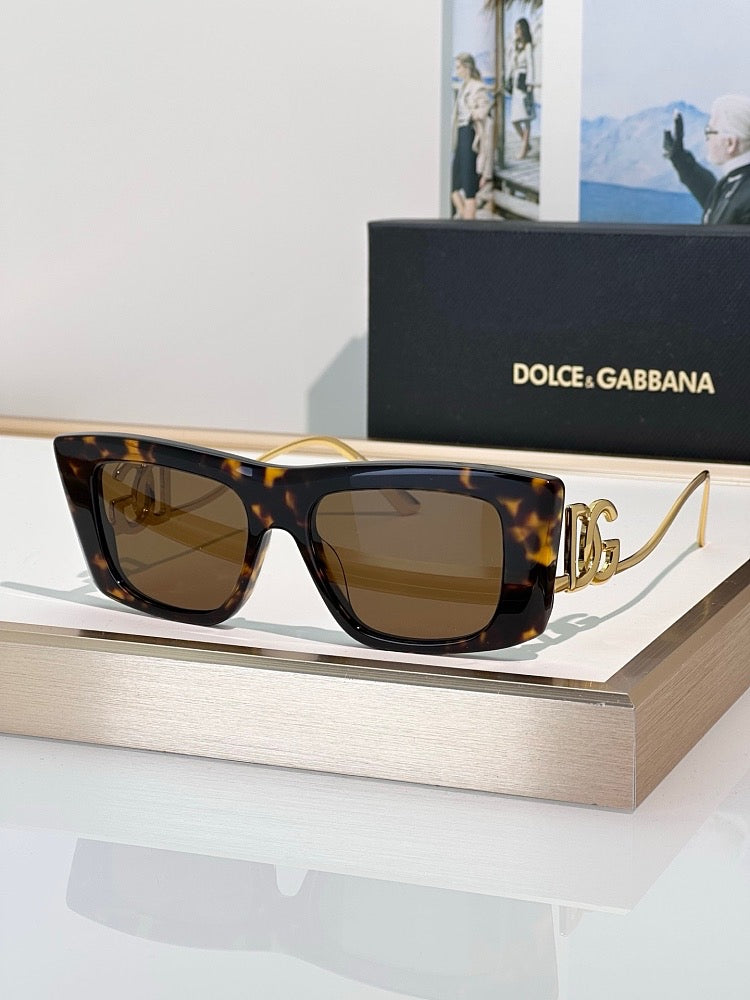The frame is cut into a slender, elongated rectangle — a couture-sharp silhouette that instantly lifts and contours the entire face. The temples are adorned with a statement DG metal monogram, cast in a raised, sculpted form with a fluid baroque-meets-modern finish. The gold arm is intentionally slim, allowing the emblem to take center stage while giving the frame a feather-light balance.