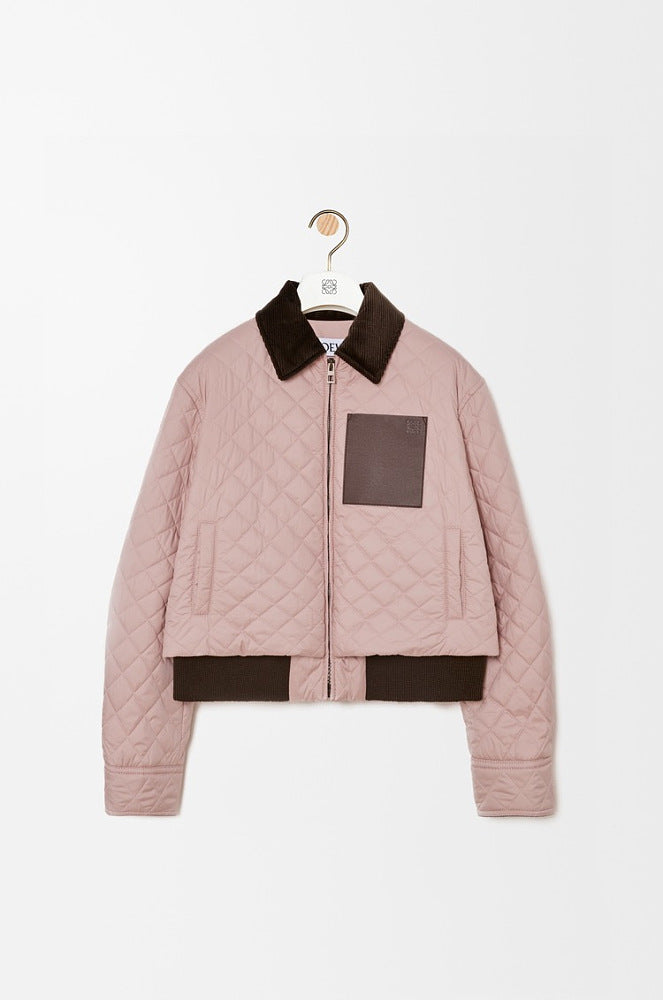 This Loewe quilted cropped jacket delivers refined modern utility with a soft, feminine edge. Crafted in a delicate blush pink diamond-quilted fabrication, the silhouette is structured yet relaxed, finished with rich contrasting details that elevate the everyday jacket into a luxury statement piece. A corduroy collar and ribbed hem add subtle texture play, while the cropped cut creates a contemporary, fashion-forward profile that pairs effortlessly with high-waisted trousers, denim, or skirts.