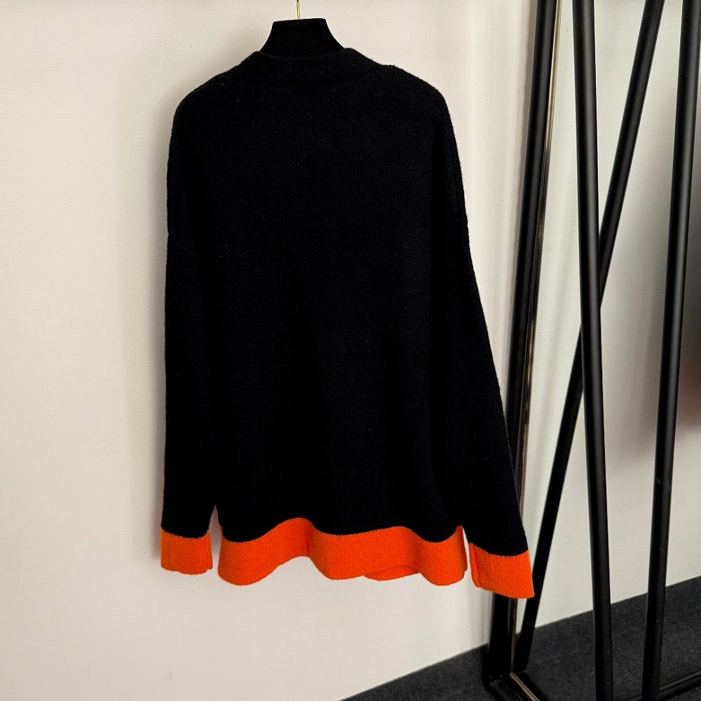 A playful yet refined expression of Loewe’s artistic DNA, the Zorro Camino cardigan blends graphic charm with elevated knit craftsmanship. Designed in a rich black knit, this statement piece is accented with a bold contrast hem in vibrant burnt orange, creating a striking visual balance that feels both modern and unmistakably Loewe.