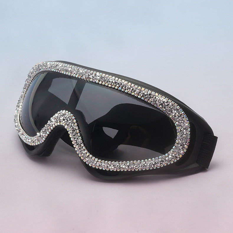 •    Oversized ski-inspired silhouette with full rhinestone crystal frame