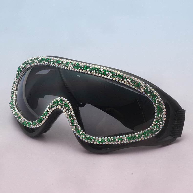 A dazzling collision of sport and couture, the Crystal Prism Shield Goggles transform performance eyewear into a statement of unapologetic glamour. Encrusted with hand-set rhinestones around a curved aerodynamic frame, these goggles catch and refract the light with every movement — whether styled for après-ski elegance, editorial shoots, or elevated streetwear.