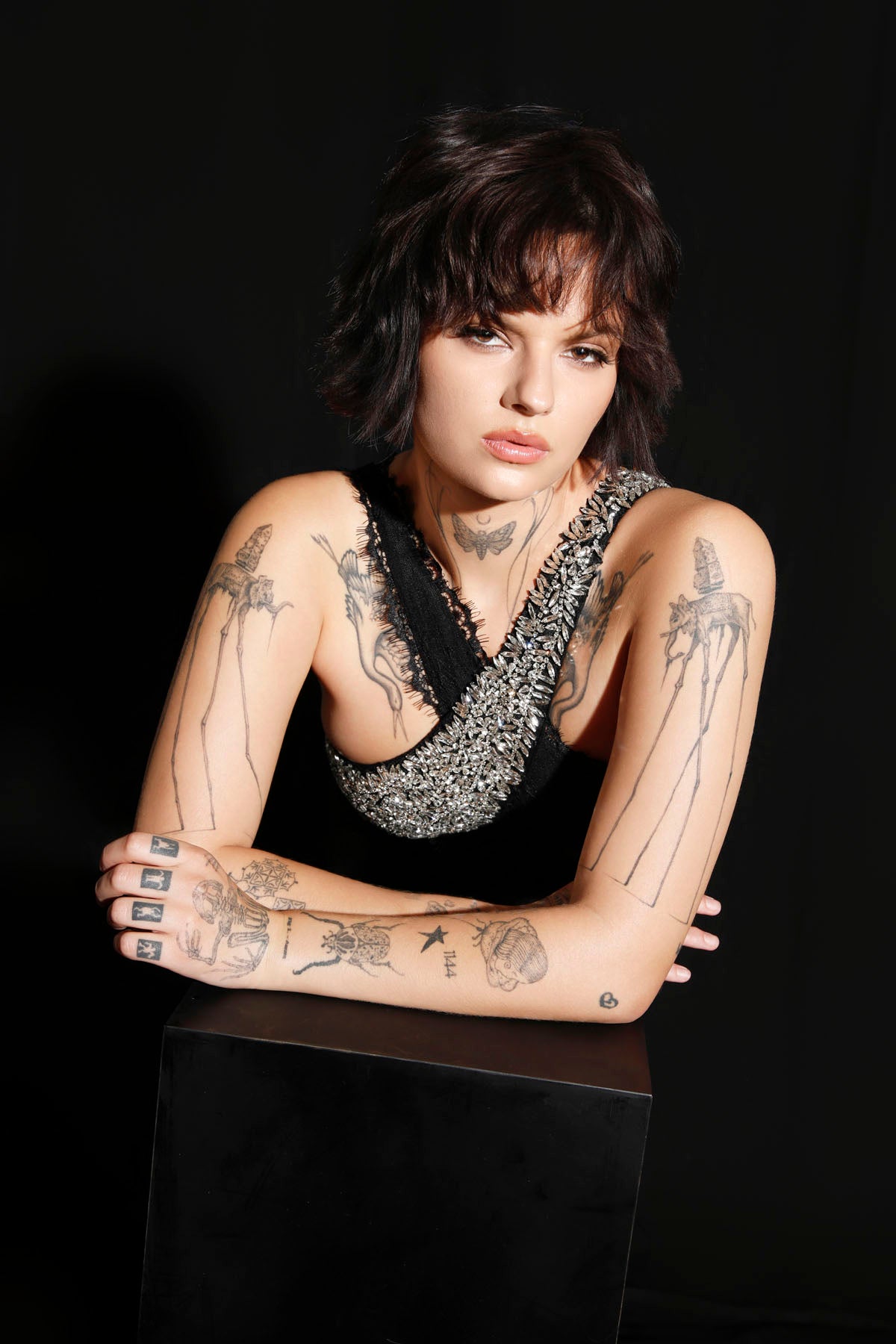 • Hand-set crystal leaf and silver embellishment across neckline and bust