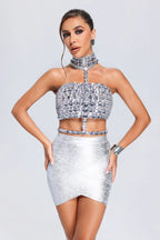 The 'Elysian Essence' Crystalized top. This gorgeous top features a choker halter design that adds a trendy and stylish touch. The top is adorned with intricate crystal detailing, creating a mesmerizing diamond-filled design. The crystals catch the light beautifully, giving off a dazzling and glamorous effect. It's a show-stopping piece that will make you feel like a true fashion icon. Pair it with your favorite bottoms and get ready to turn heads wherever you go! 😍🔥