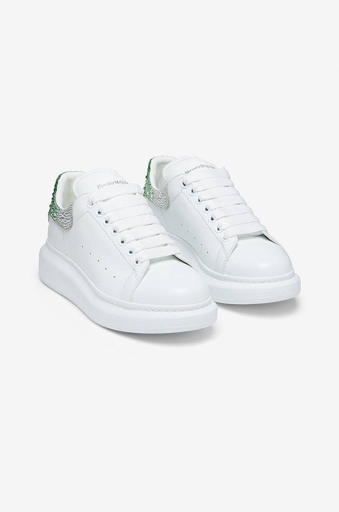 A bold, dazzling update on Alexander McQueen’s iconic oversized sneaker. Crafted in smooth white calfskin leather, this design features a crystal-embellished heel counter blending emerald green and silver rhinestones for a striking, luminous effect. Finished with the signature oversized rubber sole and wide laces, this sneaker fuses casual wearability with couture glamour — perfect for making a statement both day and night.