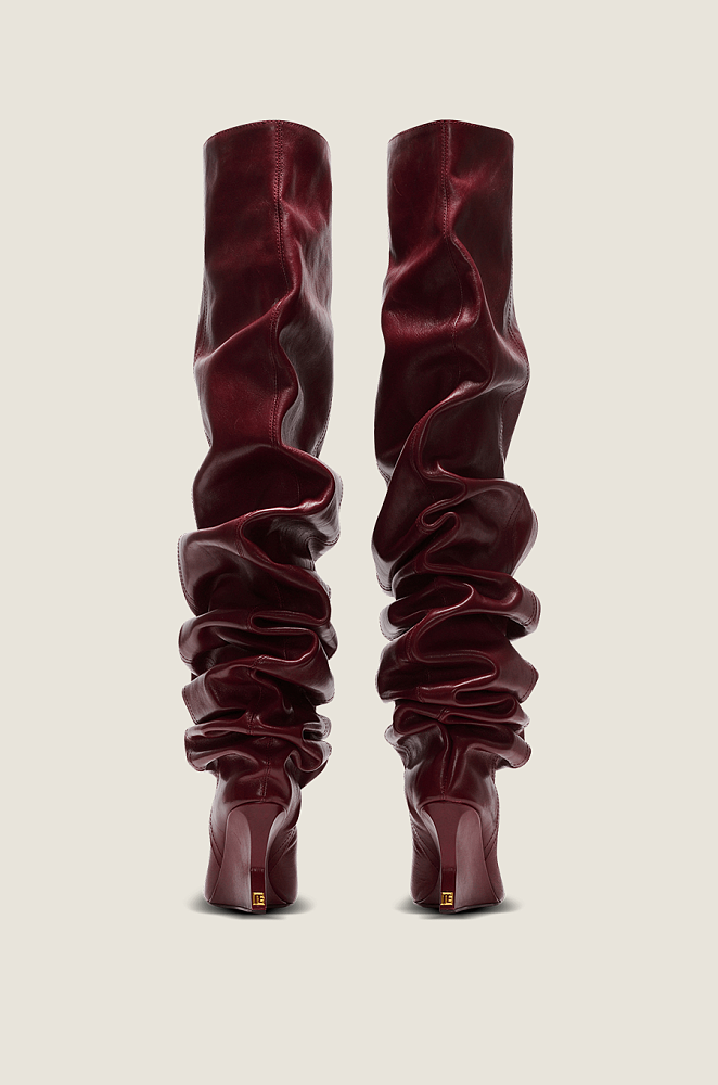 Balmain delivers a commanding, couture-driven silhouette with the “Royale Ruche” Sculpted Wedge Thigh-High Boots. Crafted in buttery smooth, high-luxury leather, these boots drape in dramatic ruched folds that ripple down the leg with intentional, architectural volume — a signature Balmain fusion of Parisian glamour and modern edge.