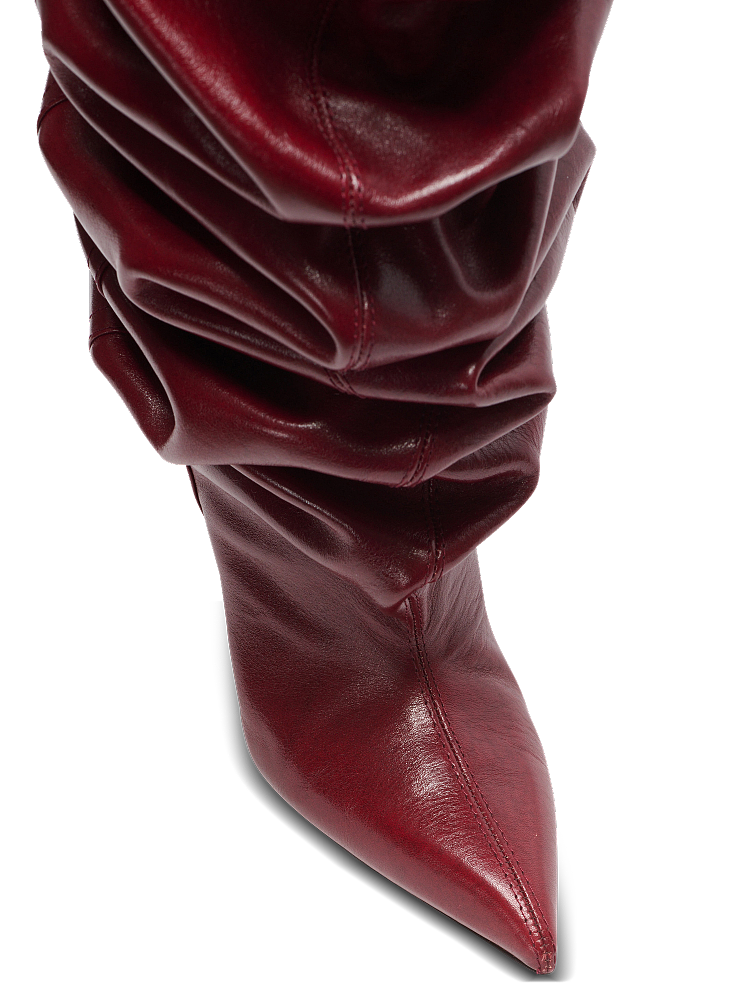 Set on a sharply carved wedge heel, the profile elongates the leg while providing stability and comfort. The pointed toe adds a sleek, feminine finish, making this an undeniable statement boot that transitions effortlessly from runway styling to nightlife opulence.