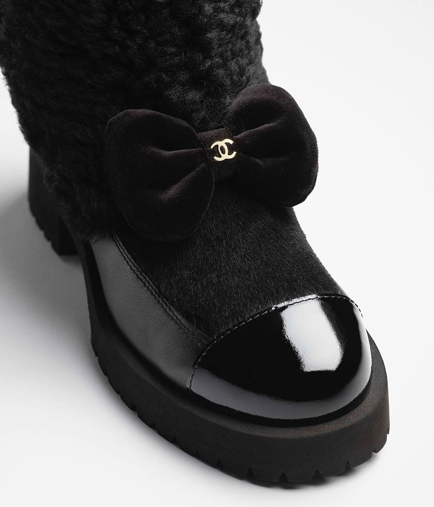 A soft velvet Camellia bow adorned with the signature gold CC emblem brings the house’s timeless romance to life, while the sturdy block sole ensures modern practicality without compromising refinement. Designed for the woman who conquers the cold in couture.