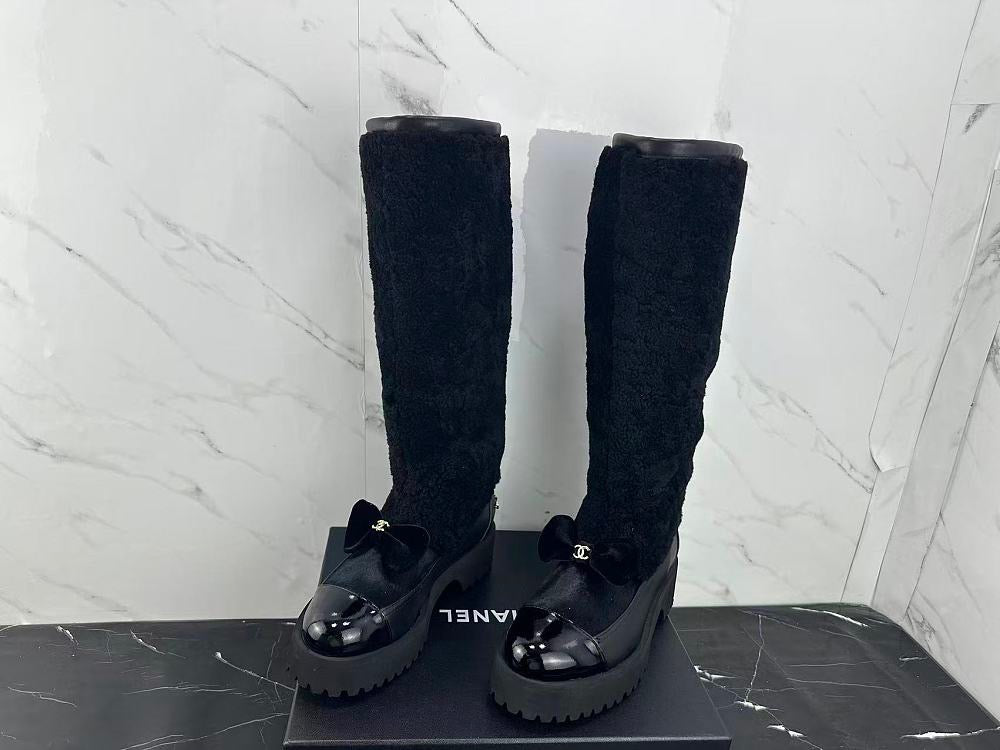 The Chanel Shearling Camellia Long Boots are a sculptural reimagining of winter luxury — a poetic balance of warmth, texture, and Parisian elegance. Wrapped in plush shearling and finished with glossy patent leather toecaps, these boots transform functional outerwear into art.