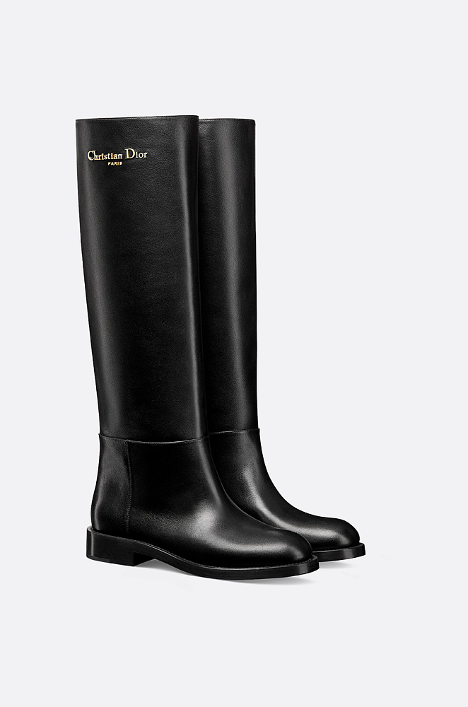 A timeless emblem of Parisian sophistication, the Christian Dior Paris Cavalier Riding Boots exude understated elegance. Crafted in smooth, supple black calfskin leather, these knee-high boots feature a streamlined silhouette with minimal seams, evoking an equestrian spirit while remaining quintessentially modern. The upper shaft is signed with the gold-tone “Christian Dior Paris” logo, offering a subtle yet distinctive house signature. A low stacked heel and almond toe provide both comfort and structure, making them versatile enough to transition seamlessly from refined daywear to evening sophistication.