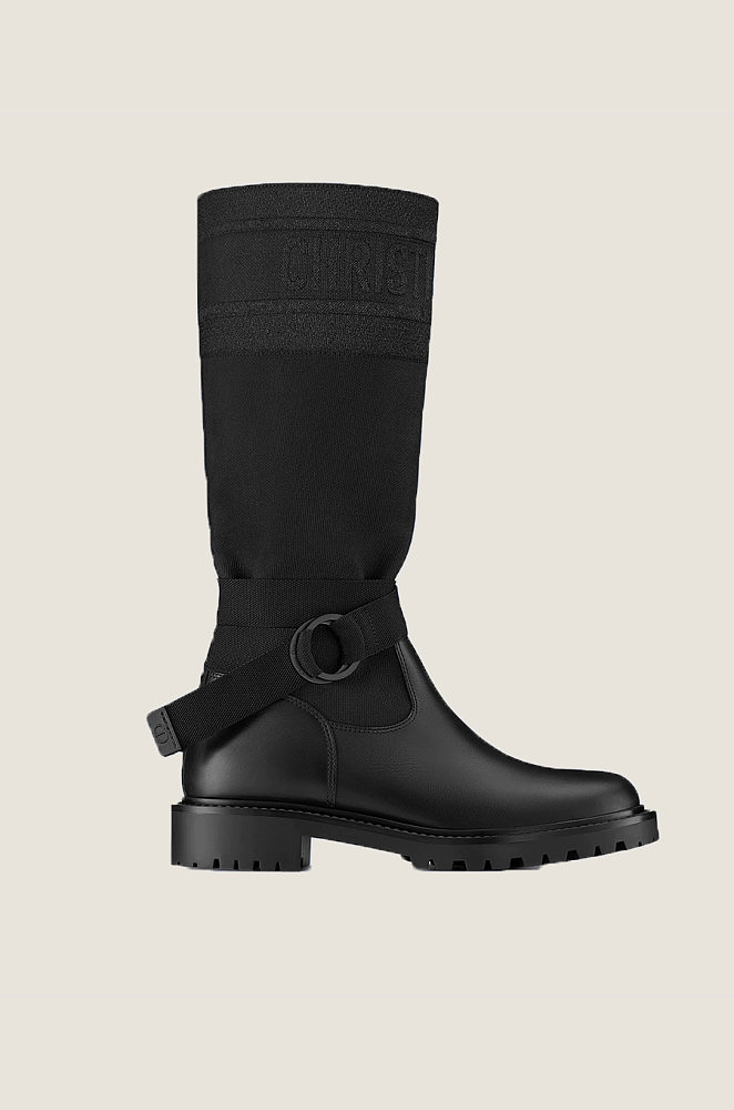 •    Signature “CHRISTIAN DIOR PARIS” logo band at upper shaft