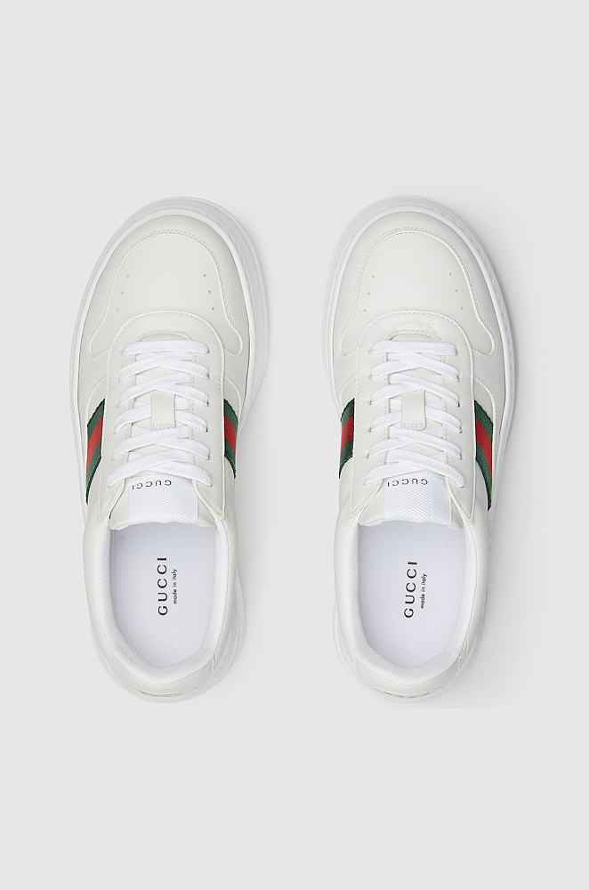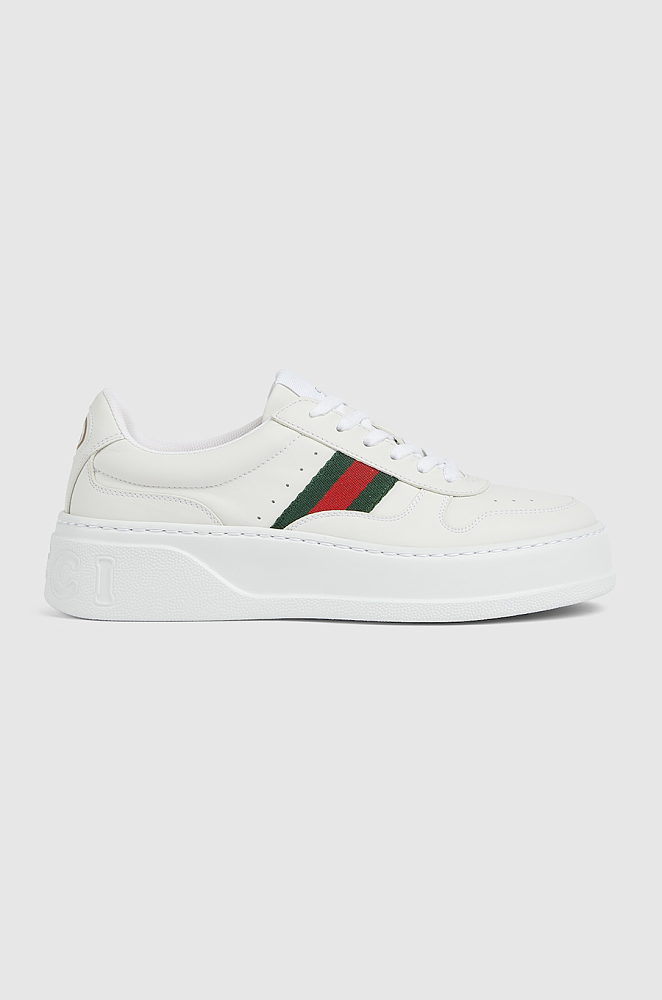 The timeless Gucci Ace sneaker reimagined with a modern platform sole. Crafted in smooth white leather, this pair highlights the maison’s heritage with its signature green and red Web stripe. The clean silhouette and embossed sole make it the ultimate sneaker for understated luxury that transitions seamlessly from day to night.