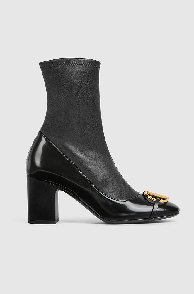 The Gucci “Vittoria Horsebit” Ankle Boots are an embodiment of timeless Italian craftsmanship and contemporary refinement. Sculpted from supple black leather with a sleek sock-style silhouette, these mid-heel boots feature a glossy patent toe capped by the iconic gold-tone horsebit — a symbol of Gucci’s equestrian heritage. The structured block heel offers both elegance and stability, while the smooth interior ensures comfort for day-to-night wear.