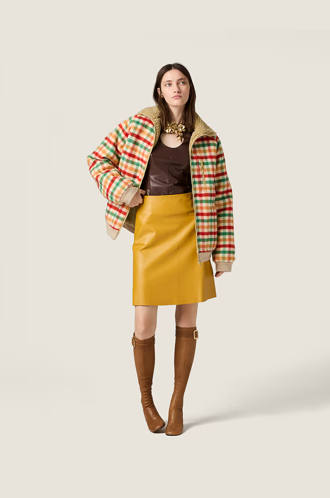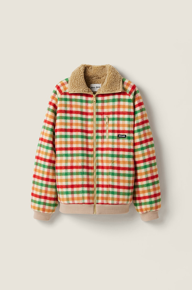 The brushed check fabric creates a soft, tactile surface reminiscent of vintage alpine coats, while the warm faux-shearling collar adds dimension, coziness, and a couture wink. A subtle front zip and ribbed hem anchor the silhouette with sporty structure, while the embroidered Miu Miu label at the chest delivers a signature dose of brand attitude — playful, intelligent, and instantly recognizable.