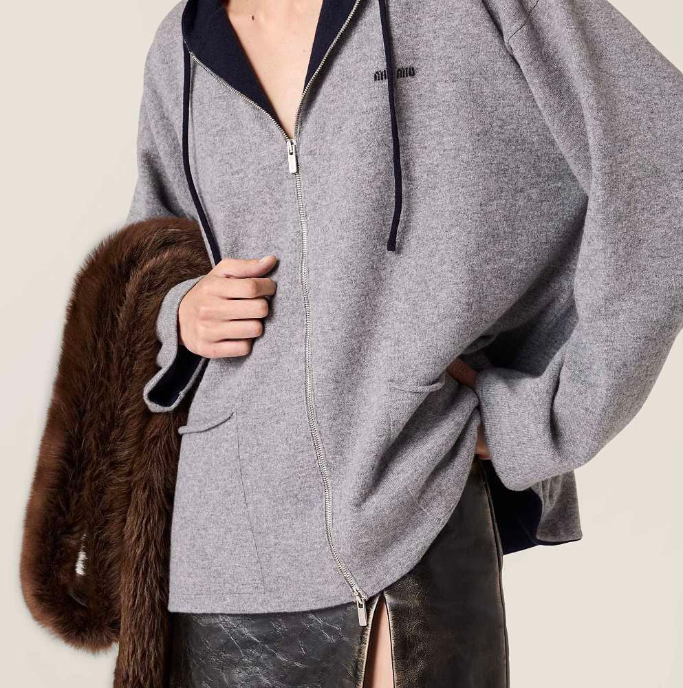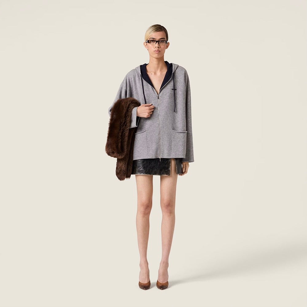 A refined interpretation of casual luxury, this Miu Miu zip-front hoodie jacket blends understated elegance with everyday comfort. Crafted in a soft wool-blend knit, the design features a clean, structured silhouette elevated by minimalist detailing and subtle logo embroidery at the chest. The hooded neckline and relaxed fit bring a modern, effortless edge, while the fine texture and tailored finish ensure a polished, boutique-worthy aesthetic.