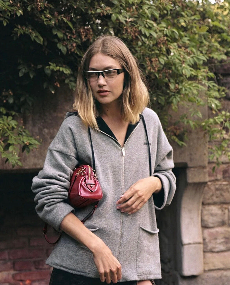 Perfect for elevated off-duty styling, this piece transitions seamlessly from travel wear to chic city layering—pair it with tailored trousers, denim, or a mini skirt for a signature Miu Miu contrast of ease and sophistication.