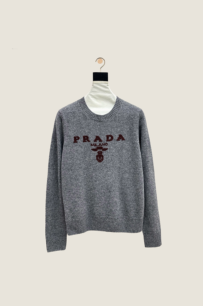 Across the chest, the historic Prada crest and MILANO insignia are rendered in dimensional chenille embroidery — a subtle yet commanding display of craftsmanship. Ribbed detailing at the hem, cuffs, and neckline create a tailored finish, while the weight and handle of the knit offer both warmth and a polished aesthetic.