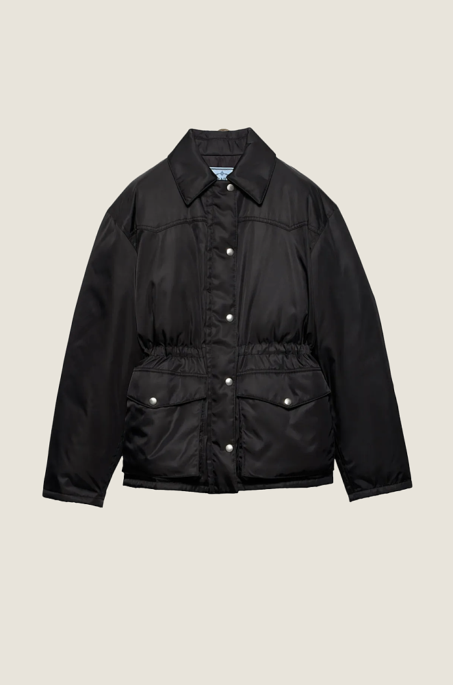 Minimalist, sculptural, and distinctly Prada — the Noir Cinched Technical Satin Utility Jacket reimagines outerwear through the house’s signature lens of quiet luxury. Crafted in a sleek black technical satin with a soft lustrous sheen, the silhouette is structured yet feminine, featuring an adjustable cinched waist that contours effortlessly to the body.