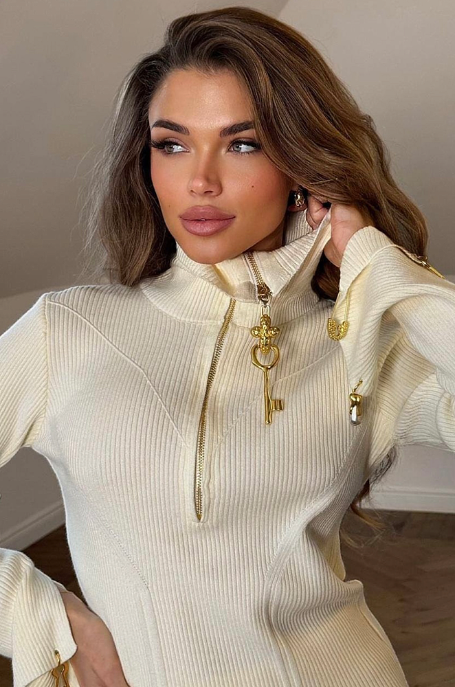 A striking embodiment of Schiaparelli’s iconic surrealist codes, the Surrealist Charm Zip-Neck Knit Midi Dress is where art meets modern femininity. Crafted in a sculpting ribbed knit, this long-sleeve midi silhouette features a sleek zip-neck collar adorned with signature gold-tone hardware—an unmistakable nod to the house’s couture heritage. Delicate charm accents trace the waist and hemline, creating subtle movement and jewelry-like detail with every step.