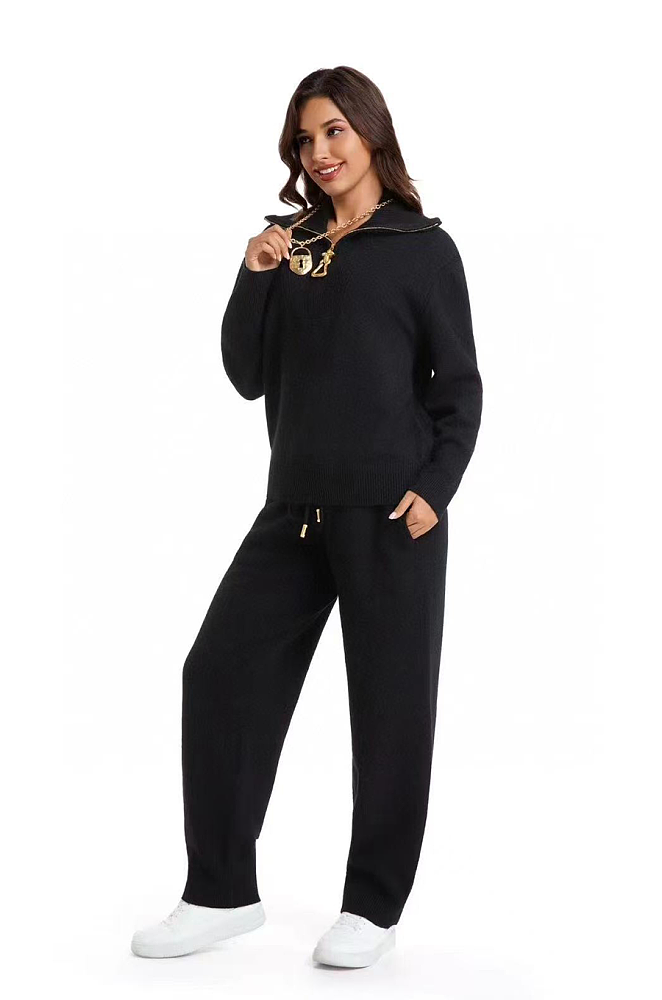 •    Two-piece knit set: zip-neck sweater + knit pants