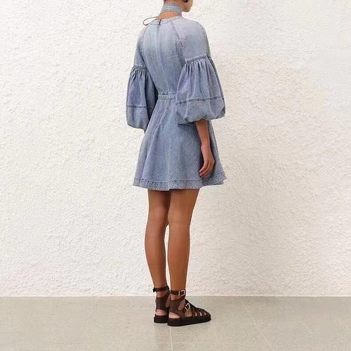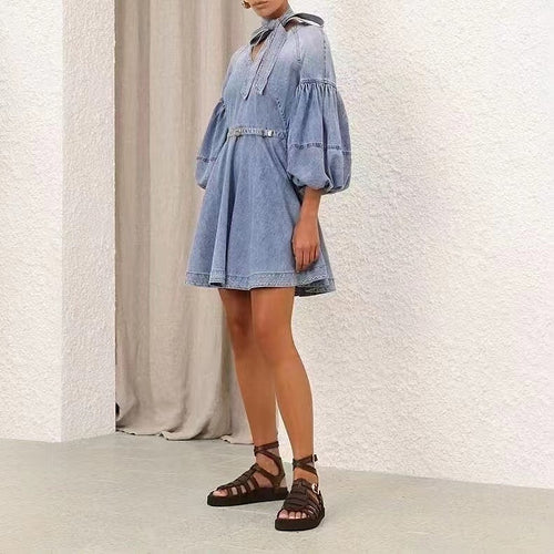 The denim upper neck offers a bold contrast, blending casual elegance with structured refinement. The deep bow tie at the neckline adds a romantic twist, an homage to vintage styles reimagined for today’s discerning fashionista. The dress is effortlessly cinched at the waist with a refined belt, accentuating the natural curves while enhancing the overall fluidity of the design.