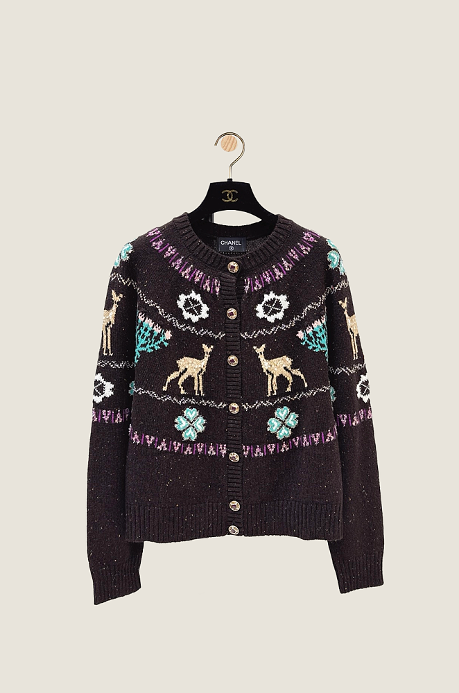The Chalet de Luxe Fair Isle Knit Cardigan from Chanel reimagines classic winter motifs through a maison-level lens—featuring delicately woven deer, snowflake medallions, and artisanal Fair Isle patterns, all sculpted from a rich, textural wool blend.