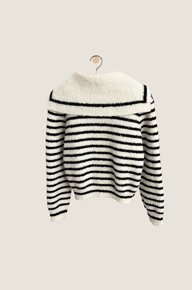 An ode to Parisian elegance, the Marinière d’Hiver cardigan from Dior merges nautical heritage with winter luxury. Crafted in plush bouclé knit, its black-and-ivory stripes evoke the effortless sophistication of the French Riviera, while the embroidered Christian Dior Paris Atelier motif at the chest adds a couture-level finish. The sailor-collar silhouette and soft, relaxed structure lend it both coziness and refinement — a versatile piece that captures Dior’s timeless charm.