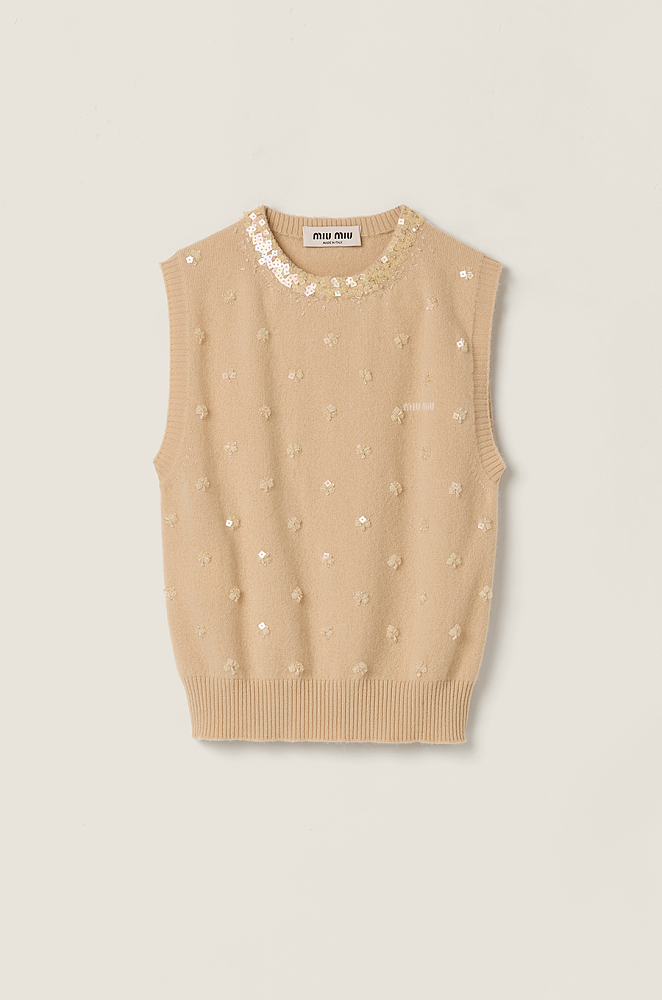 Miu Miu “Petal Éclat” Embellished Cashmere Knit Vest — Nude Beige | S–L