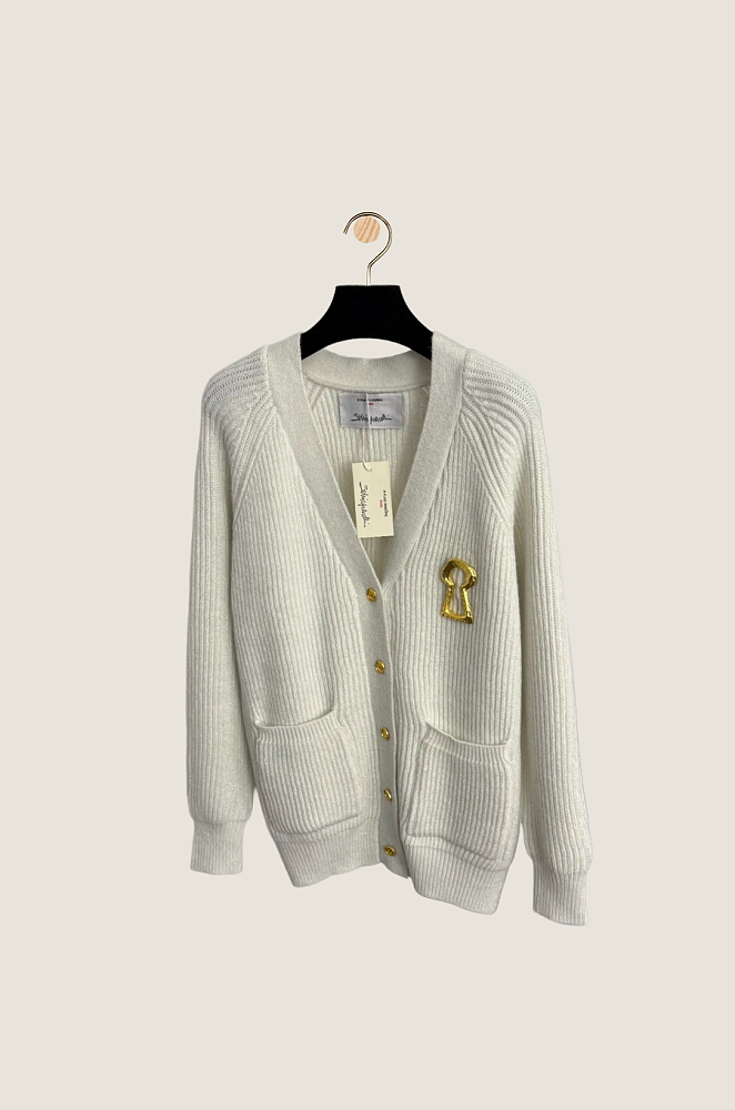 A couture-inspired knit that feels effortless yet undeniably powerful. This Schiaparelli-style cardigan elevates classic ribbed tailoring with the house’s signature surrealist touch: a bold, sculpted gold keyhole emblem placed over the heart.