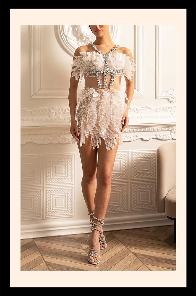 From the Velour de Luxe Award Couture Collection, the “Aile de Cristal” Mini Dress captures the ethereal poetry of modern couture. Designed to mirror angelic wings in motion, this handcrafted masterpiece features delicately sculpted sheer organza feathers layered to perfection, forming a radiant silhouette that shimmers with every step.