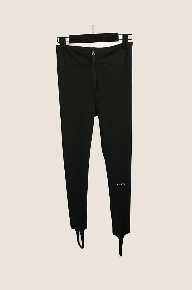 The Alaïa Sculpt Stirrup Leggings embody the brand’s mastery of structure and silhouette, merging athletic precision with haute couture refinement. Crafted from a sculpting stretch fabric that contours the body with a second-skin fit, these leggings feature a front zip closure, ergonomic seam lines, and subtle Alaïa logo detailing at the hem.
