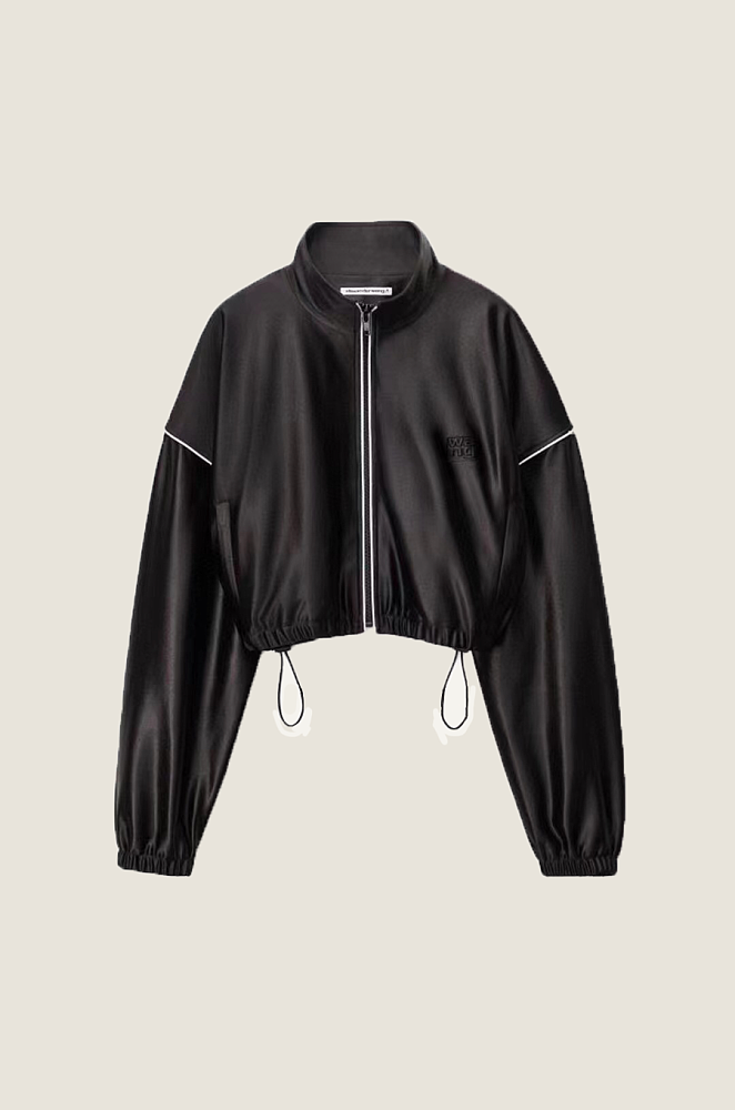 The cropped zip-front jacket features drawcord detailing and refined white piping for a sculpted, fashion-forward silhouette. Matching wide-leg track pants flow seamlessly, defined by a double waistband and subtle WANG logo embroidery that punctuates the sleek finish. A statement in laid-back luxury, this look captures the essence of downtown athletic glamour.