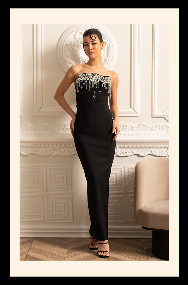 Sculptural elegance meets celestial allure in the Astrella Noire Gown. Crafted in a sleek black silhouette, this strapless masterpiece is adorned with hand-placed crystal embellishments that cascade like jeweled constellations across the bodice. The elongated column form sculpts the figure with modern precision, while the back slit ensures graceful movement. Designed for the woman who commands presence with quiet confidence, this gown captures the poetry of midnight opulence.