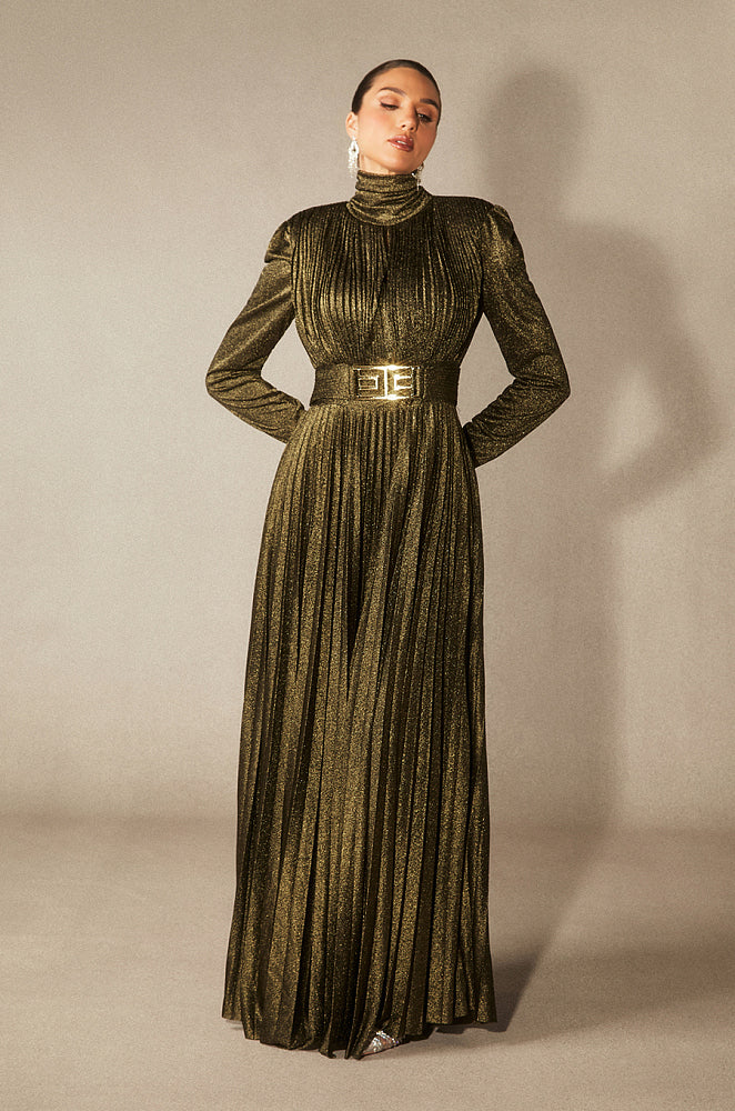 A commanding vision of modern elegance, the Aurelia Dominion Pleated Gown is sculpted to radiate authority and refinement. Crafted in luminous metallic fabric with a rich olive-gold undertone, this floor-length silhouette features finely pressed pleats that cascade with fluid movement. A structured high neckline and softly contoured shoulders lend architectural presence, while the wide, statement belt defines the waist with polished precision. Designed for grand entrances and unforgettable evenings, this gown balances power dressing with effortless grace.