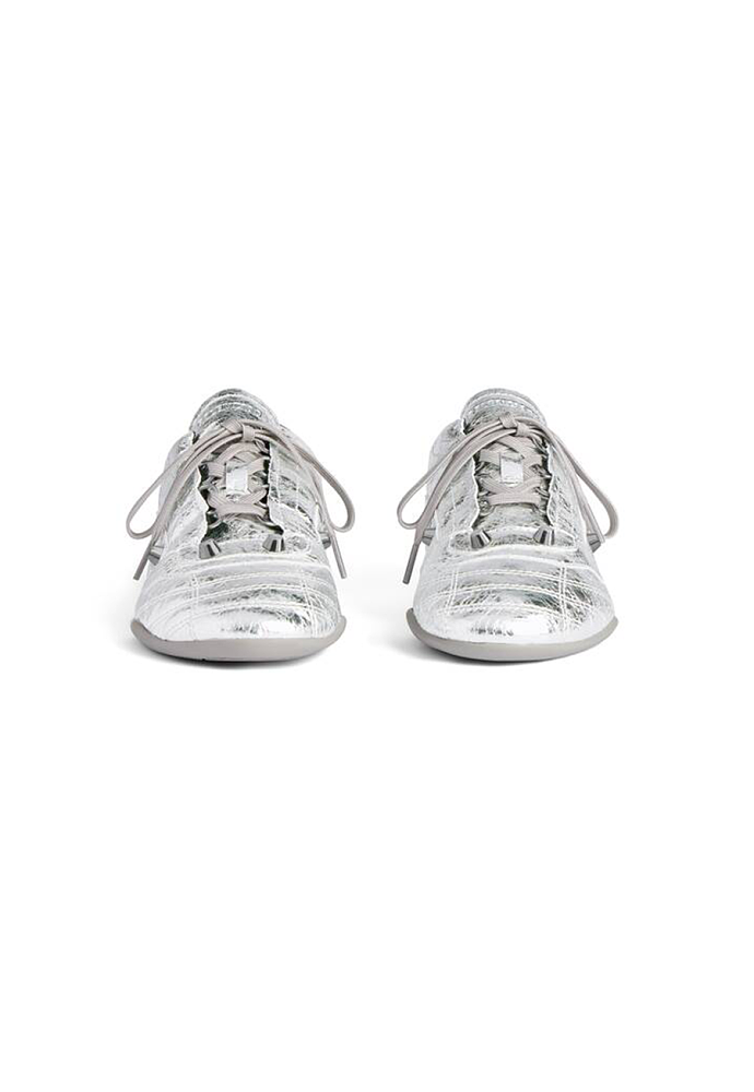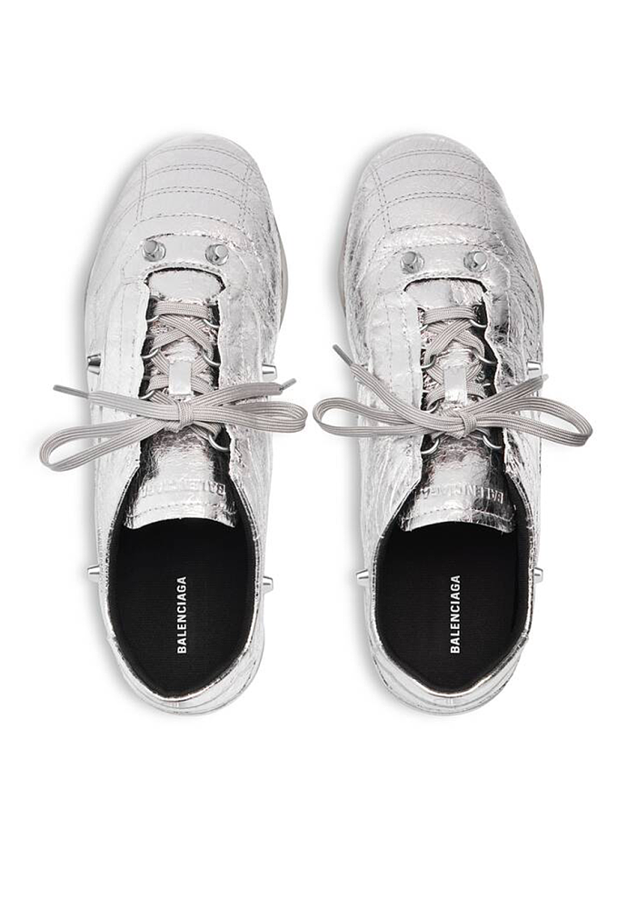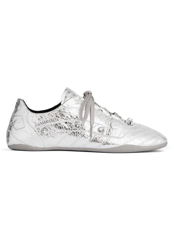 Balenciaga delivers a futuristic take on everyday luxury with the Crush Sneakers in Metallic Silver. Defined by its sculptural, low-profile silhouette and cracked foil leather finish, this pair channels the house’s signature blend of rebellion and refinement. The metallic sheen captures light with every step, while the lightweight sole ensures comfort without compromising couture precision. A statement in motion—modern, reflective, and unmistakably Balenciaga.
