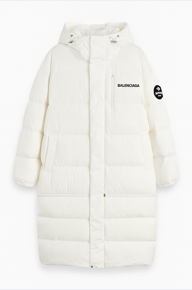 The Balenciaga Oversized Logo Down Puffer is the ultimate blend of streetwear edge and luxury craftsmanship. Designed in a crisp winter white, this longline silhouette envelops you in warmth while maintaining the house’s signature oversized proportions. Featuring a high padded hood, concealed front zip closure, and elasticized cuffs, it delivers both utility and style.