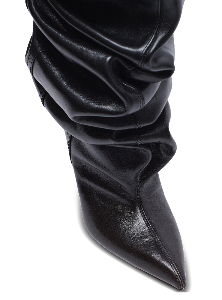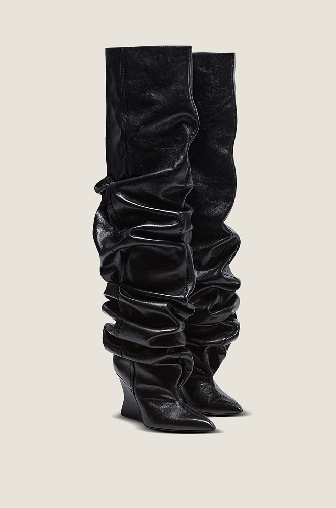 Set on a sharply carved wedge heel, the profile elongates the leg while providing stability and comfort. The pointed toe adds a sleek, feminine finish, making this an undeniable statement boot that transitions effortlessly from runway styling to nightlife opulence.