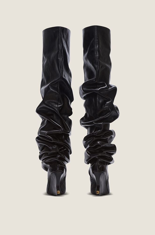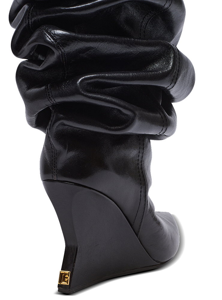 Balmain delivers a commanding, couture-driven silhouette with the “Royale Ruche” Sculpted Wedge Thigh-High Boots. Crafted in buttery smooth, high-luxury leather, these boots drape in dramatic ruched folds that ripple down the leg with intentional, architectural volume — a signature Balmain fusion of Parisian glamour and modern edge.