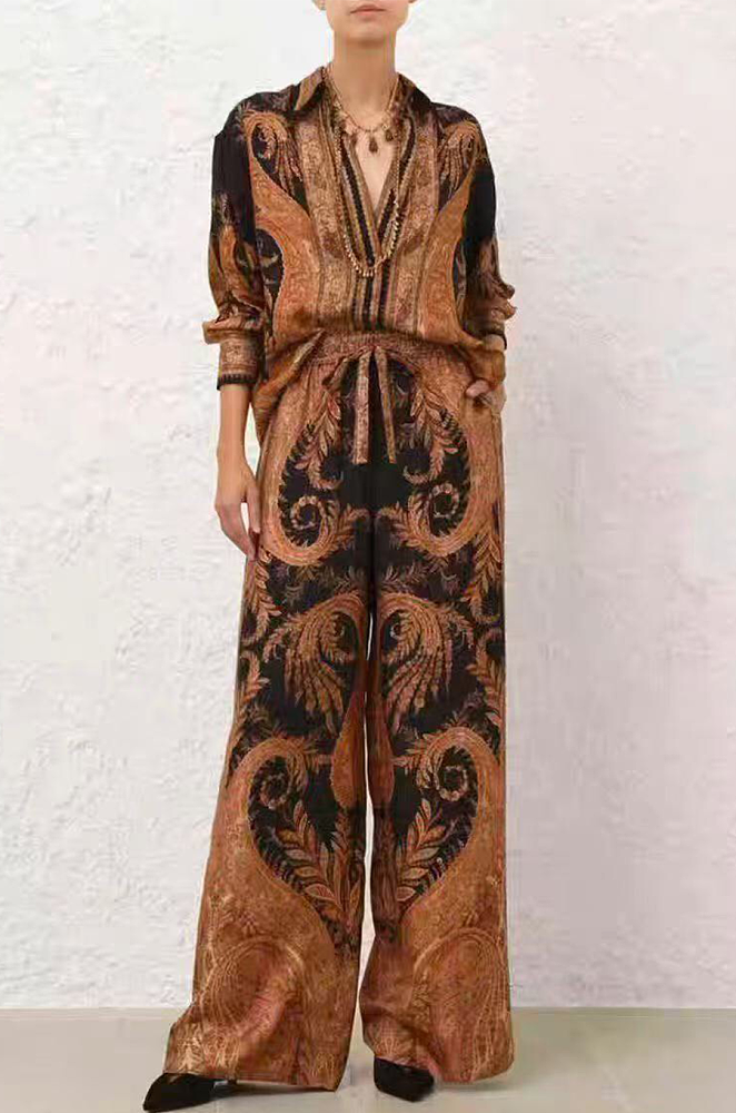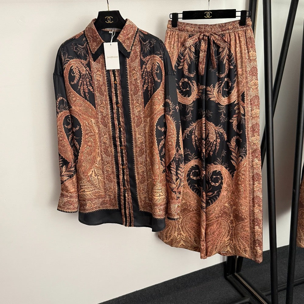 Dramatic and effortlessly refined, the Barocco Ember Silk Ensemble channels Zimmermann’s opulent codes of romantic tailoring. Crafted in a lustrous silk-blend fabric, this set pairs a fluid button-down blouse with coordinating wide-leg trousers, both drenched in intricate bronze-and-black baroque motifs. The shirt features a relaxed silhouette with subtle tailoring at the shoulders, while the pants fall in a sweeping drape that elongates the frame.