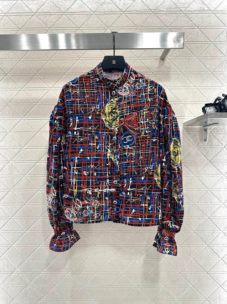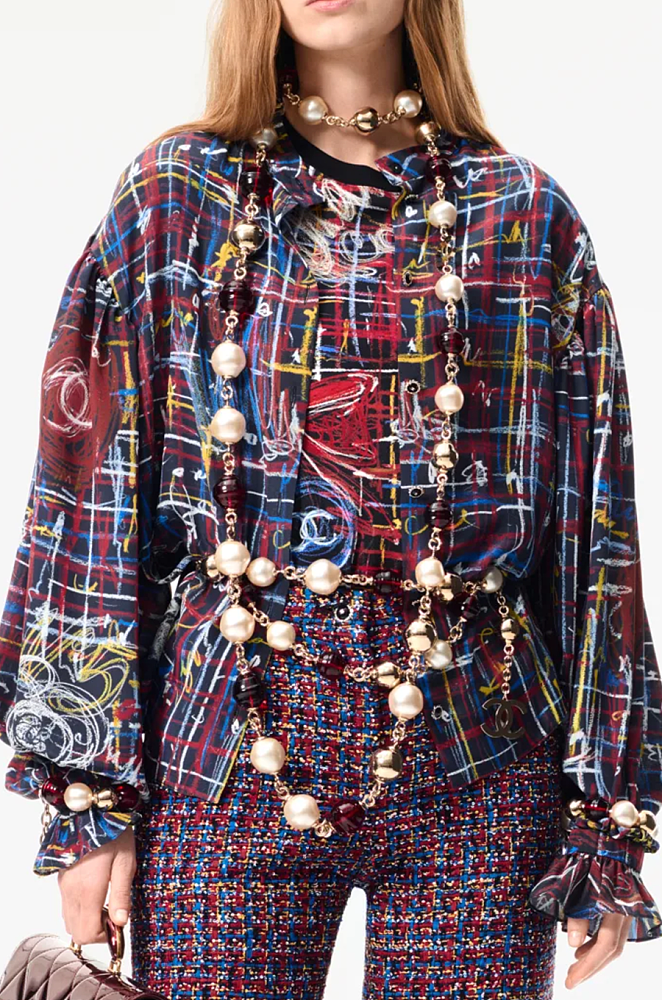 The Chanel Abstract Tweed & Sketch Blouse fuses artistic rebellion with Parisian refinement — a poetic collision of texture, pattern, and modern couture. Crafted from airy silk crepe, the piece features a hand-painted grid motif inspired by Karl’s atelier sketches, woven in vivid tones of crimson, cobalt, and gold. The relaxed silhouette with gathered sleeves and a fluid drape channels effortless runway attitude, while the subtle “CC” script and line-art accents celebrate the maison’s creative legacy.