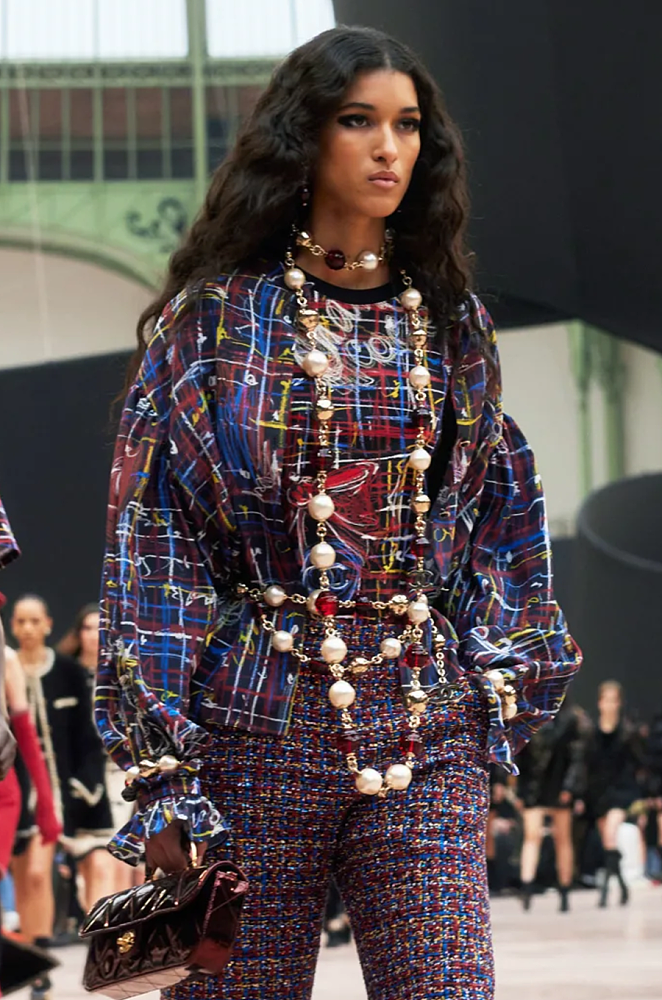 Pair with the matching Chanel multicolor tweed trousers or tailored black pants for a commanding runway silhouette. Elevate with layered pearl necklaces, a quilted mini bag, and patent boots for a Paris-inspired street-couture finish.