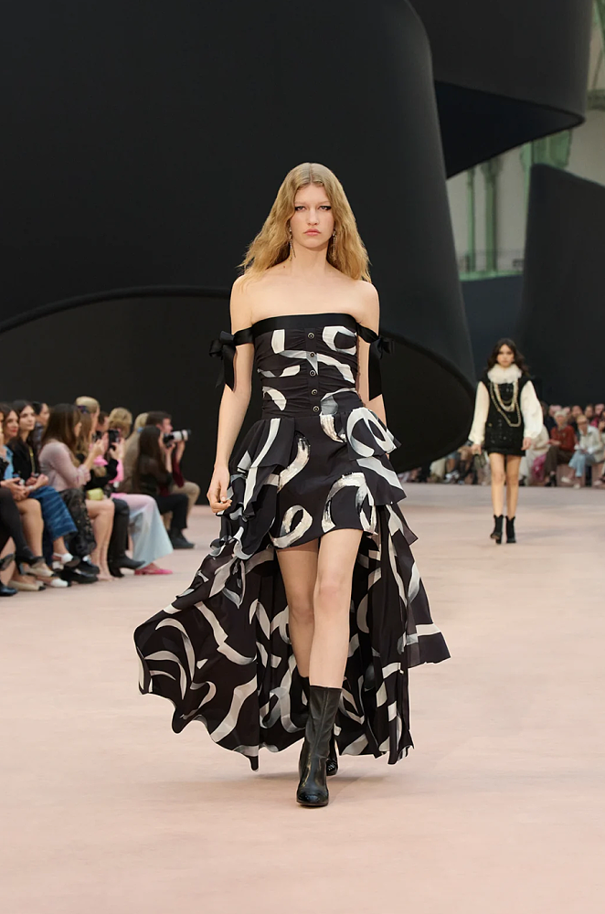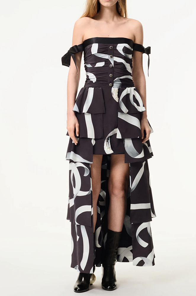 The Chanel Brushstroke Cascade Gown is a breathtaking fusion of artistry and architecture — designed for the woman who commands a room with presence and poise. This statement gown showcases the maison’s signature brushstroke monogram motif in sweeping black and silver tones, painted across a fluid silk canvas. The structured bodice features couture-inspired ruching and button accents, descending into tiered asymmetric panels that move with ethereal grace. Off-shoulder satin bows delicately frame the silhouette, adding a whisper of romance to its modern edge.